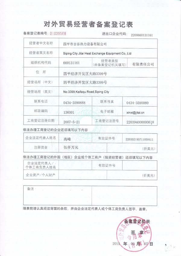 • SIPING JITAI HEAT EXCHANGE EQUIPMENT CO.,LTD. 四平市吉泰熱力設(shè)備有限公司